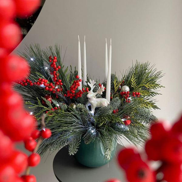 Помимо рождественских венчиков, Amber Flower House предлагает приобрести невероятно изысканные рождественские композиции. Эти изделия принято ставить на праздничный стол. Согласно традициям, хвойную композицию круглой формы помещают в центре стола, обязательно украшают ее свечами, символизирующими свет.