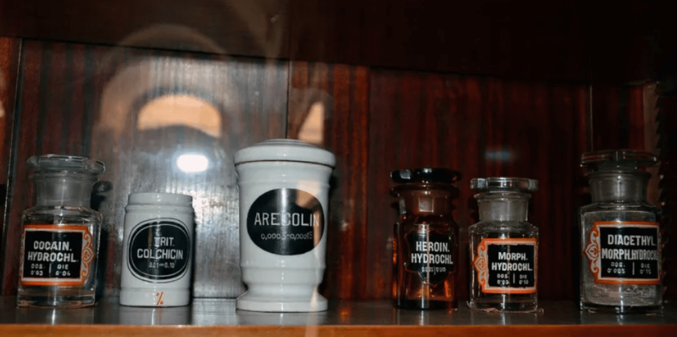 Среди разнообразия бутылочек, можно разглядеть мензурки с надписями наркотических веществ «морфий», «кокаин», «героин». В древности эти наркотики считались лекарствами и были в открытой продаже. В 1914 году эти препараты запретили.