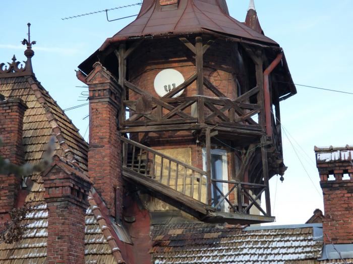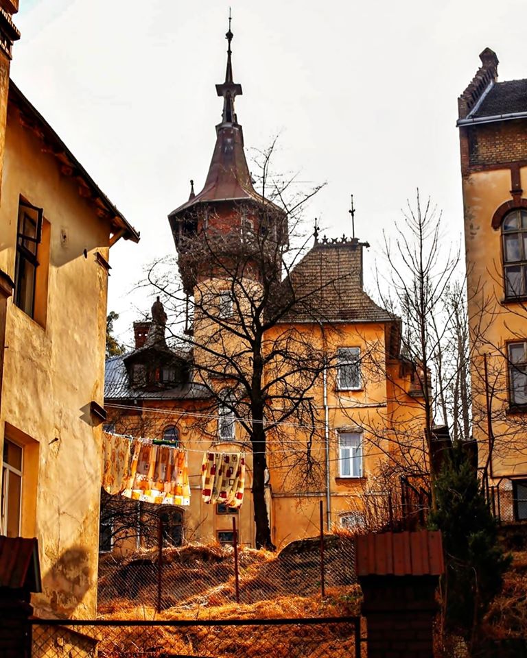 Отличается вилла тем, что она возвышается над всеми другими жилыми домами. Вверху — высокая башня, черепичная крыша сложной конфигурации, ретро-дымоходы из кирпича и шпили, что какбудто дырявят изменчивое львовское небо.