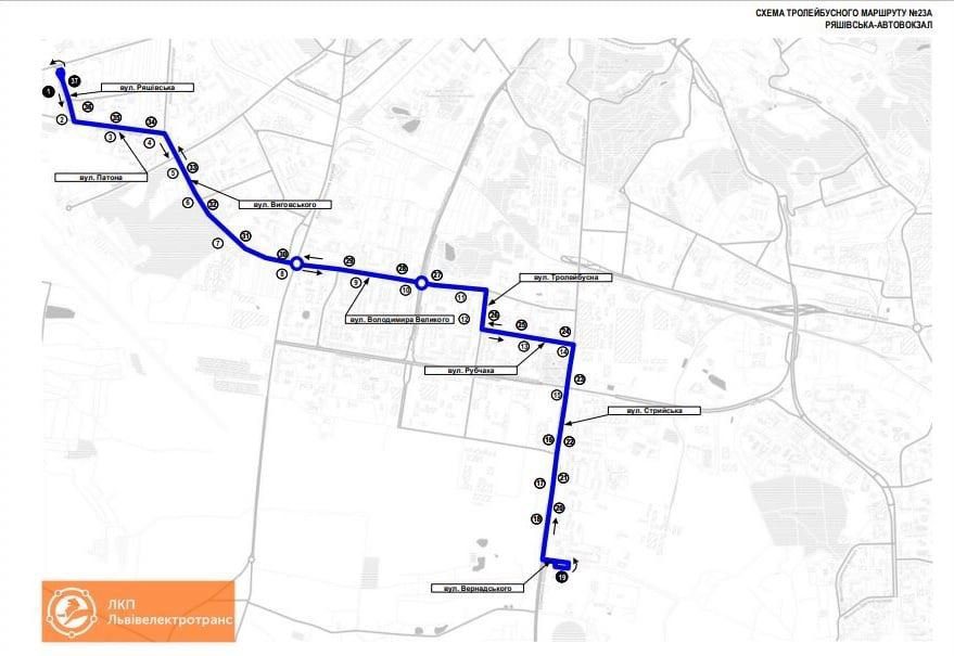 Будут курсировать троллейбусы от Центрального автовокзала, на улице Стрыйской, в район улицы Ряшевской. В общем, маршрут №23-А проходит по такому направлению: улица Ряшевская, улица Патона, улица Выговского, улица Владимира Великого, улица Троллейбусная, улица Рубчака, улица Стрыйская, улица Вернадского (Автовокзал) и в обратном направлении.