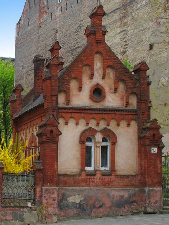 Цегляний будинок буквально потопає у зелені саду, висадженого на прилеглій території. Маленькі надбудови у вигляді невеликих башточок додають будинку цікавинки – навіть проходячи мимоволі повз віллу, ви обов’язково звернете увагу і на саму будівлю, і на її цікавий архітектурний стиль.