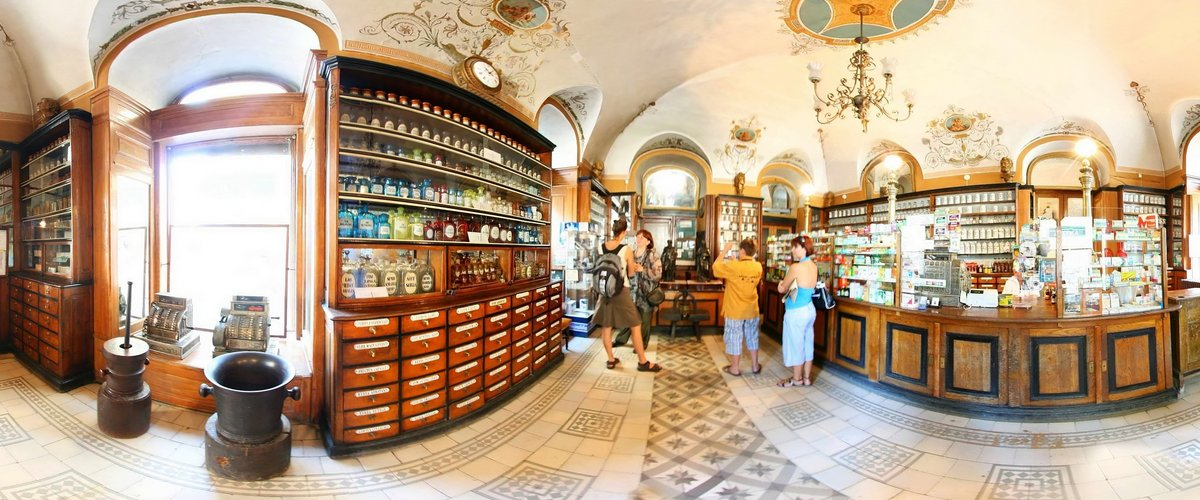 Переступивши поріг аптеки-музею, наче потрапляєш у розкішну старовину. Власники аптек намагались привабити клієнтів. Тому тут можна побачити декоративні меблі, художні розписи на стінах та стелі, а також вітражами декоровані вікна. Інтер’єр торгового залу оздоблений поліхромними розписами віденських майстрів.